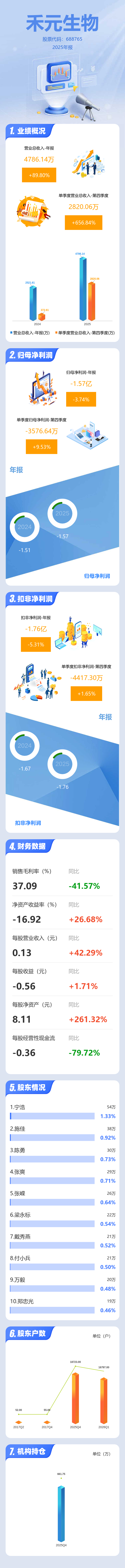 证券之星消息,禾元生物2025年年报显示,当年度公司主营收入4786.14万元,同比上升89.8%;归母净利润-1.57亿元,同比下降3.75%;扣非净利润-1.76亿元,同比下降5.32%;其中2025年第四季度,公司单季度主营收入2820.06万元,同比上升656.84%;单季度归母净利润-3576.64万元,同比上升9.54%;单季度扣非净利润-4417.3万元,同比上升1.66%;负债率21.74%,投资收益90.75万元,财务费用547.9万元,毛利率37.09%。