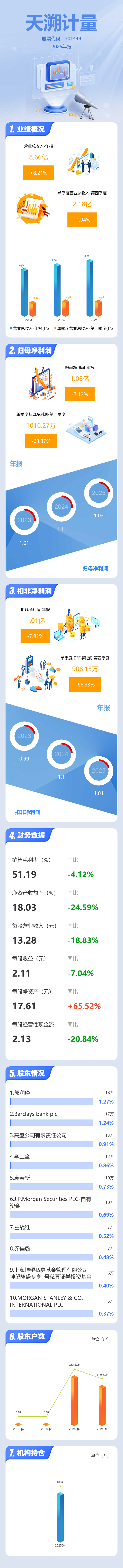 证券之星消息,天溯计量2025年年报显示,当年度公司主营收入8.66亿元,同比上升8.22%;归母净利润1.03亿元,同比下降7.12%;扣非净利润1.01亿元,同比下降7.91%;其中2025年第四季度,公司单季度主营收入2.18亿元,同比下降1.94%;单季度归母净利润1016.27万元,同比下降63.38%;单季度扣非净利润908.13万元,同比下降66.94%;负债率13.96%,投资收益1.84万元,财务费用-29.56万元,毛利率51.19%。