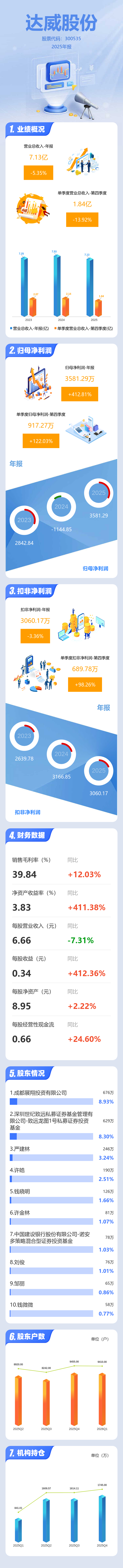 证券之星消息,达威股份2025年年报显示,当年度公司主营收入7.13亿元,同比下降5.35%;归母净利润3581.29万元,同比上升412.82%;扣非净利润3060.17万元,同比下降3.37%;其中2025年第四季度,公司单季度主营收入1.84亿元,同比下降13.92%;单季度归母净利润917.27万元,同比上升122.03%;单季度扣非净利润689.78万元,同比上升98.27%;负债率31.57%,投资收益-490.55万元,财务费用690.24万元,毛利率39.84%。