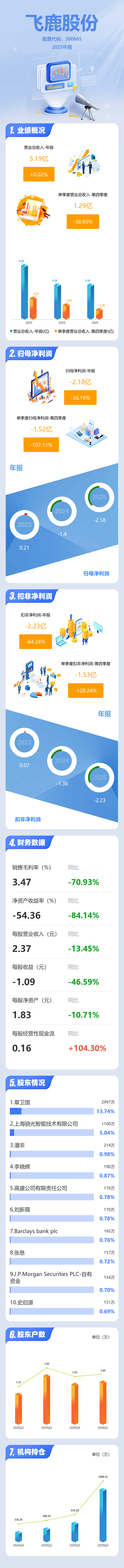 证券之星消息,飞鹿股份2025年年报显示,当年度公司主营收入5.19亿元,同比上升0.03%;归母净利润-2.18亿元,同比下降56.16%;扣非净利润-2.23亿元,同比下降64.24%;其中2025年第四季度,公司单季度主营收入1.29亿元,同比下降36.85%;单季度归母净利润-1.52亿元,同比下降107.12%;单季度扣非净利润-1.53亿元,同比下降128.25%;负债率72.92%,投资收益287.36万元,财务费用3073.76万元,毛利率3.47%。