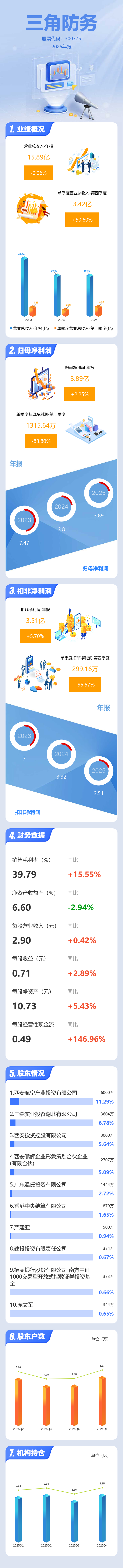 证券之星消息,三角防务2025年年报显示,当年度公司主营收入15.89亿元,同比下降0.07%;归母净利润3.89亿元,同比上升2.25%;扣非净利润3.51亿元,同比上升5.7%;其中2025年第四季度,公司单季度主营收入3.42亿元,同比上升50.6%;单季度归母净利润1315.64万元,同比下降83.8%;单季度扣非净利润299.16万元,同比下降95.58%;负债率29.22%,投资收益2718.67万元,财务费用-689.07万元,毛利率39.79%。