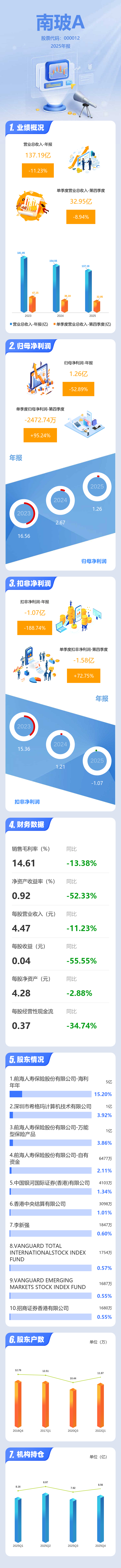 证券之星消息,南玻A2025年年报显示,当年度公司主营收入137.19亿元,同比下降11.23%;归母净利润1.26亿元,同比下降52.89%;扣非净利润-1.07亿元,同比下降188.75%;其中2025年第四季度,公司单季度主营收入32.95亿元,同比下降8.94%;单季度归母净利润-2472.74万元,同比上升95.24%;单季度扣非净利润-1.58亿元,同比上升72.76%;负债率56.7%,投资收益-1109.01万元,财务费用2.17亿元,毛利率14.61%。