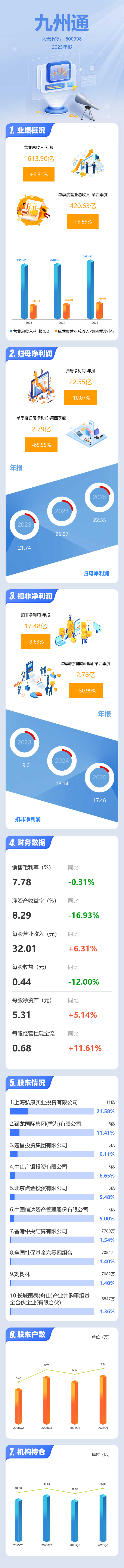 证券之星消息,九州通2025年年报显示,当年度公司主营收入1613.9亿元,同比上升6.31%;归母净利润22.55亿元,同比下降10.07%;扣非净利润17.48亿元,同比下降3.63%;其中2025年第四季度,公司单季度主营收入420.63亿元,同比上升9.6%;单季度归母净利润2.79亿元,同比下降65.56%;单季度扣非净利润2.78亿元,同比上升50.99%;负债率68.33%,投资收益10.0亿元,财务费用9.42亿元,毛利率7.78%。