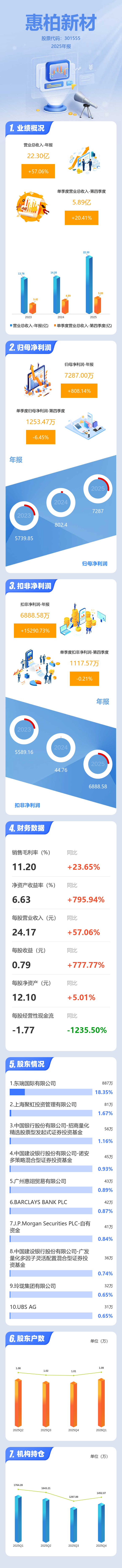 证券之星消息,惠柏新材2025年年报显示,当年度公司主营收入22.3亿元,同比上升57.06%;归母净利润7287.0万元,同比上升808.15%;扣非净利润6888.58万元,同比上升15290.73%;其中2025年第四季度,公司单季度主营收入5.89亿元,同比上升20.42%;单季度归母净利润1253.47万元,同比下降6.46%;单季度扣非净利润1117.57万元,同比下降0.21%;负债率57.78%,投资收益231.12万元,财务费用1457.22万元,毛利率11.2%。