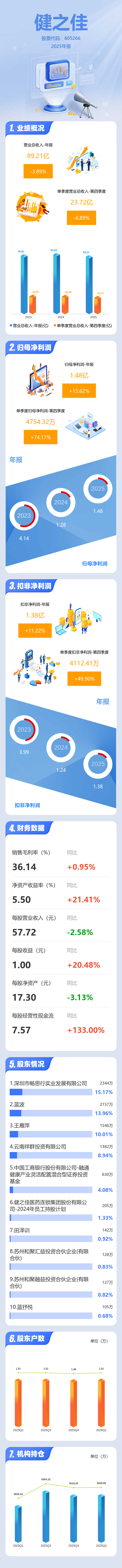 证券之星消息,健之佳2025年年报显示,当年度公司主营收入89.21亿元,同比下降3.9%;归母净利润1.48亿元,同比上升15.63%;扣非净利润1.38亿元,同比上升11.22%;其中2025年第四季度,公司单季度主营收入23.72亿元,同比下降6.89%;单季度归母净利润4754.32万元,同比上升74.18%;单季度扣非净利润4112.41万元,同比上升49.91%;负债率72.61%,投资收益-745.7万元,财务费用1.3亿元,毛利率36.14%。