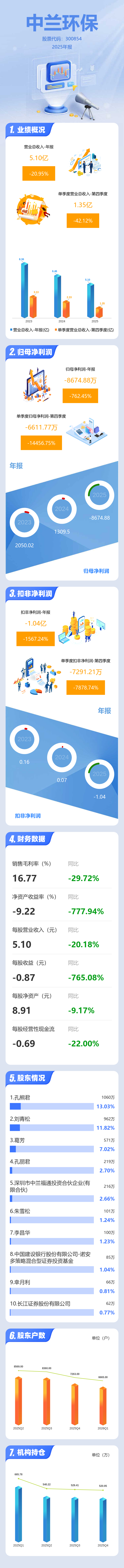 证券之星消息,中兰环保2025年年报显示,当年度公司主营收入5.1亿元,同比下降20.96%;归母净利润-8674.88万元,同比下降762.46%;扣非净利润-1.04亿元,同比下降1567.24%;其中2025年第四季度,公司单季度主营收入1.35亿元,同比下降42.13%;单季度归母净利润-6611.77万元,同比下降14456.75%;单季度扣非净利润-7291.21万元,同比下降7878.75%;负债率37.88%,投资收益-250.41万元,财务费用-13.89万元,毛利率16.77%。