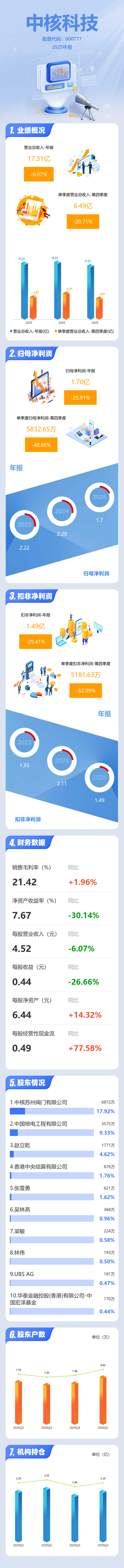 证券之星消息,中核科技2025年年报显示,当年度公司主营收入17.31亿元,同比下降6.08%;归母净利润1.7亿元,同比下降25.92%;扣非净利润1.49亿元,同比下降29.41%;其中2025年第四季度,公司单季度主营收入6.49亿元,同比下降20.71%;单季度归母净利润5832.65万元,同比下降48.67%;单季度扣非净利润5181.63万元,同比下降52.09%;负债率36.12%,投资收益9990.42万元,财务费用570.91万元,毛利率21.42%。