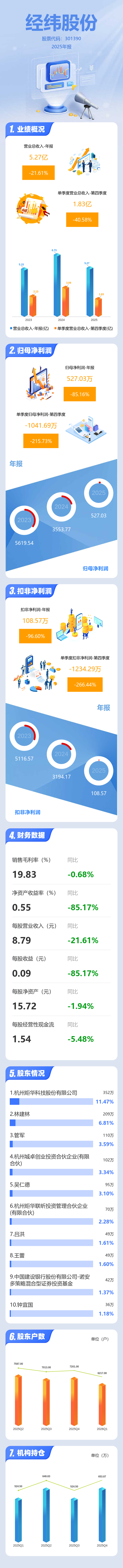 证券之星消息,经纬股份2025年年报显示,当年度公司主营收入5.27亿元,同比下降21.61%;归母净利润527.03万元,同比下降85.17%;扣非净利润108.57万元,同比下降96.6%;其中2025年第四季度,公司单季度主营收入1.83亿元,同比下降40.59%;单季度归母净利润-1041.69万元,同比下降215.74%;单季度扣非净利润-1234.29万元,同比下降266.44%;负债率48.73%,投资收益97.09万元,财务费用-575.7万元,毛利率19.83%。