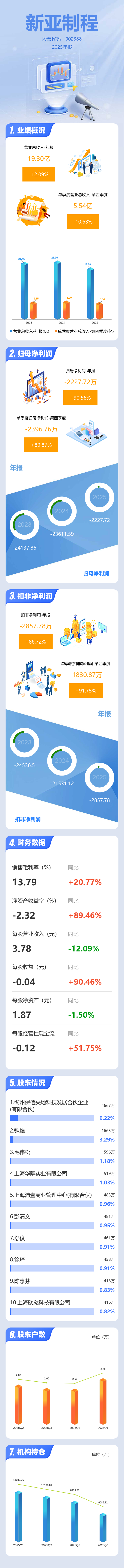 证券之星消息,新亚制程2025年年报显示,当年度公司主营收入19.3亿元,同比下降12.09%;归母净利润-2227.72万元,同比上升90.57%;扣非净利润-2857.78万元,同比上升86.73%;其中2025年第四季度,公司单季度主营收入5.54亿元,同比下降10.64%;单季度归母净利润-2396.76万元,同比上升89.88%;单季度扣非净利润-1830.87万元,同比上升91.75%;负债率59.23%,投资收益2993.05万元,财务费用5811.24万元,毛利率13.79%。