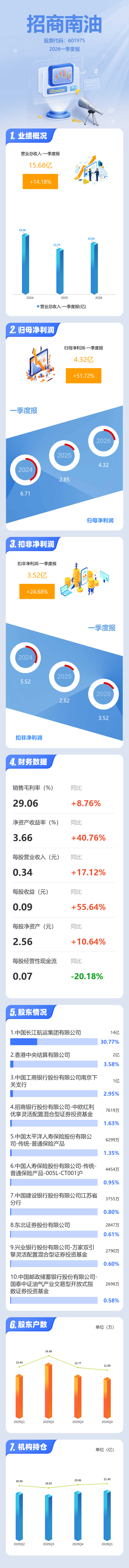 证券之星消息,招商南油2026年一季报显示,一季度公司主营收入15.68亿元,同比上升14.19%;归母净利润4.32亿元,同比上升51.73%;扣非净利润3.52亿元,同比上升24.68%;负债率11.08%,财务费用-1180.51万元,毛利率29.06%。