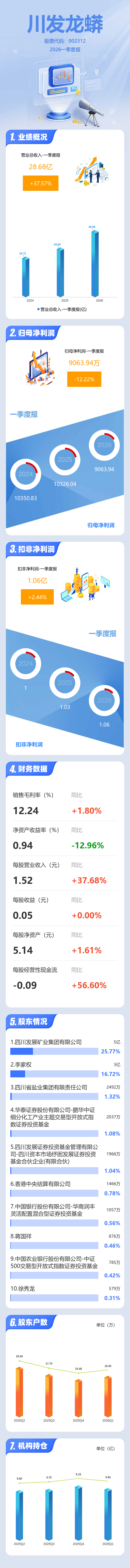 证券之星消息,川发龙蟒2026年一季报显示,一季度公司主营收入28.68亿元,同比上升37.57%;归母净利润9063.94万元,同比下降12.22%;扣非净利润1.06亿元,同比上升2.45%;负债率50.29%,投资收益3109.01万元,财务费用3838.58万元,毛利率12.24%。