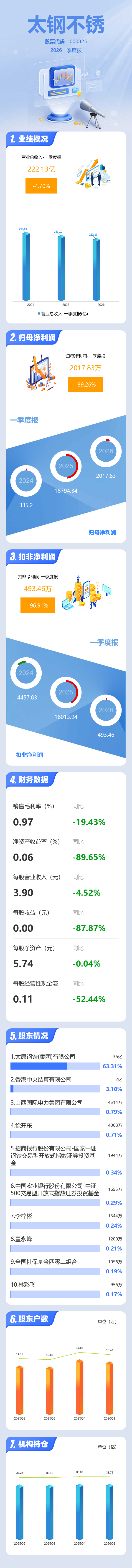 证券之星消息,太钢不锈2026年一季报显示,一季度公司主营收入222.13亿元,同比下降4.71%;归母净利润2017.83万元,同比下降89.26%;扣非净利润493.46万元,同比下降96.92%;负债率44.61%,投资收益3041.86万元,财务费用1891.36万元,毛利率0.97%。