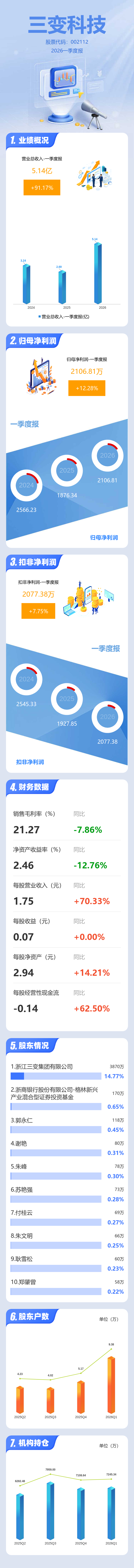证券之星消息,三变科技2026年一季报显示,一季度公司主营收入5.14亿元,同比上升91.17%;归母净利润2106.81万元,同比上升12.28%;扣非净利润2077.38万元,同比上升7.76%;负债率65.51%,投资收益-2.67万元,财务费用662.83万元,毛利率21.27%。