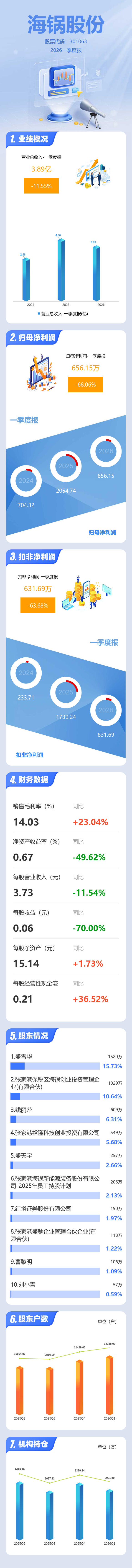证券之星消息,海锅股份2026年一季报显示,一季度公司主营收入3.89亿元,同比下降11.55%;归母净利润656.15万元,同比下降68.07%;扣非净利润631.69万元,同比下降63.68%;负债率39.37%,投资收益-112.28万元,财务费用1139.92万元,毛利率14.03%。
