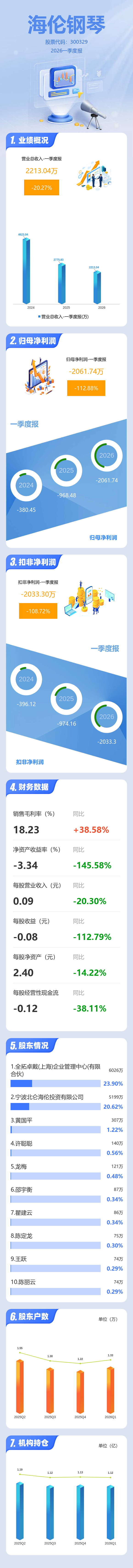 证券之星消息,海伦钢琴2026年一季报显示,一季度公司主营收入2213.04万元,同比下降20.27%;归母净利润-2061.74万元,同比下降112.88%;扣非净利润-2033.3万元,同比下降108.72%;负债率41.18%,财务费用335.94万元,毛利率18.23%。