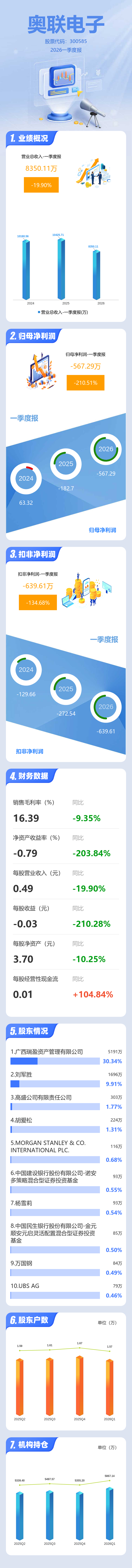 证券之星消息,奥联电子2026年一季报显示,一季度公司主营收入8350.11万元,同比下降19.91%;归母净利润-567.29万元,同比下降210.51%;扣非净利润-639.61万元,同比下降134.69%;负债率25.8%,投资收益-100.23万元,财务费用-1.77万元,毛利率16.39%。