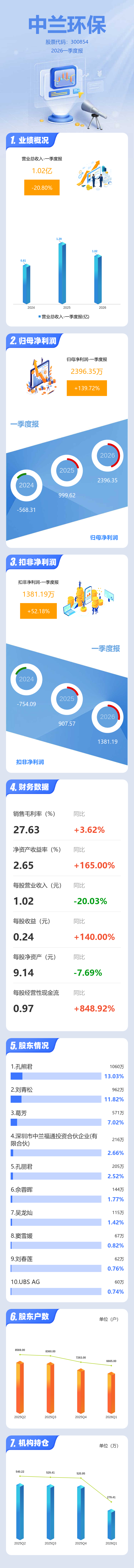 证券之星消息,中兰环保2026年一季报显示,一季度公司主营收入1.02亿元,同比下降20.8%;归母净利润2396.35万元,同比上升139.73%;扣非净利润1381.19万元,同比上升52.19%;负债率34.85%,投资收益150.11万元,财务费用-7.36万元,毛利率27.63%。