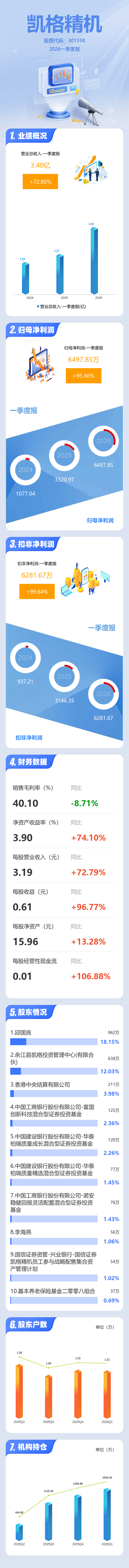 证券之星消息,凯格精机2026年一季报显示,一季度公司主营收入3.4亿元,同比上升72.8%;归母净利润6497.85万元,同比上升95.66%;扣非净利润6281.67万元,同比上升99.65%;负债率39.87%,投资收益199.69万元,财务费用-672.4万元,毛利率40.1%。