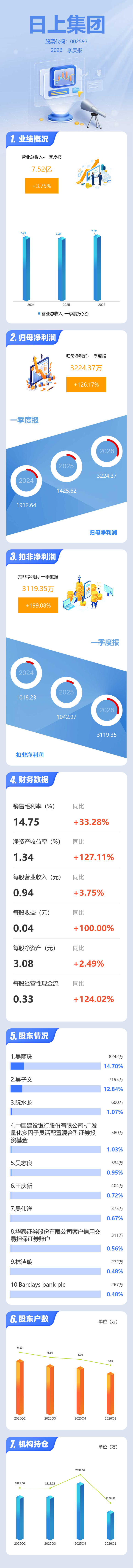证券之星消息,日上集团2026年一季报显示,一季度公司主营收入7.52亿元,同比上升3.76%;归母净利润3224.37万元,同比上升126.17%;扣非净利润3119.35万元,同比上升199.08%;负债率49.92%,投资收益39.6万元,财务费用2086.07万元,毛利率14.75%。