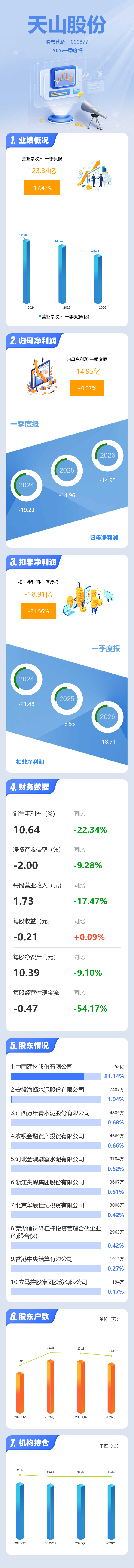 证券之星消息,天山股份2026年一季报显示,一季度公司主营收入123.34亿元,同比下降17.48%;归母净利润-14.95亿元,同比上升0.08%;扣非净利润-18.91亿元,同比下降21.56%;负债率68.09%,投资收益-4640.16万元,财务费用7.54亿元,毛利率10.64%。