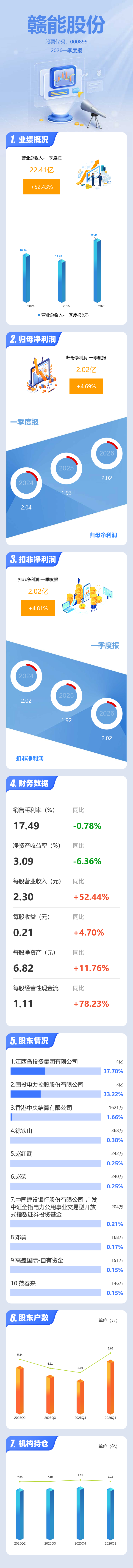 证券之星消息,赣能股份2026年一季报显示,一季度公司主营收入22.41亿元,同比上升52.44%;归母净利润2.02亿元,同比上升4.69%;扣非净利润2.02亿元,同比上升4.81%;负债率63.33%,投资收益3321.47万元,财务费用6987.62万元,毛利率17.49%。