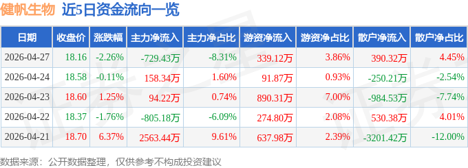 证券之星消息,截至2026年4月27日收盘,健帆生物(300529)报收于18.16元,下跌2.26%,换手率0.94%,成交量4.82万手,成交额8777.01万元。