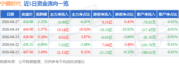 证券之星消息,截至2026年4月27日收盘,宁德时代(300750)报收于434.88元,下跌2.25%,换手率0.78%,成交量33.06万手,成交额145.14亿元。