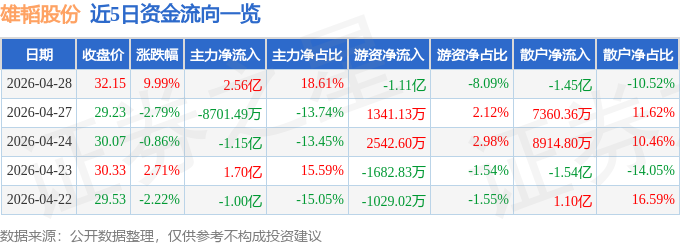 证券之星消息,雄韬股份4月28日涨停收盘,收盘价32.15元。该股于11点18分涨停,3次打开涨停,截止收盘封单资金为5284.82万元,占其流通市值0.45%。