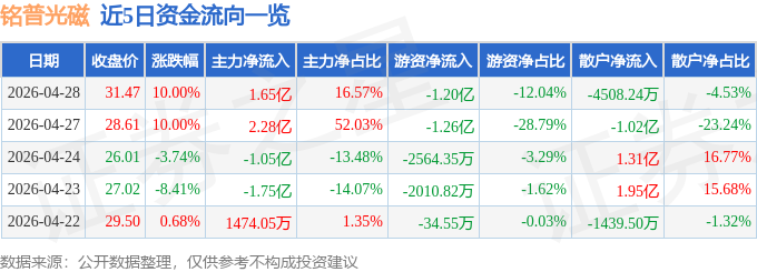 4月28日的资金流向数据方面,主力资金净流入1.65亿元,占总成交额16.57%,游资资金净流出1.2亿元,占总成交额12.04%,散户资金净流出4508.24万元,占总成交额4.53%。