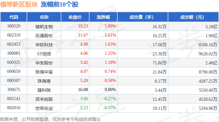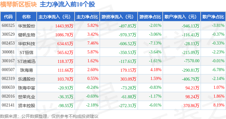 从资金流向上来看,当日横琴新区板块主力资金净流出2.21亿元,游资资金净流入3402.27万元,散户资金净流入1.87亿元。横琴新区板块个股资金流向见下表: