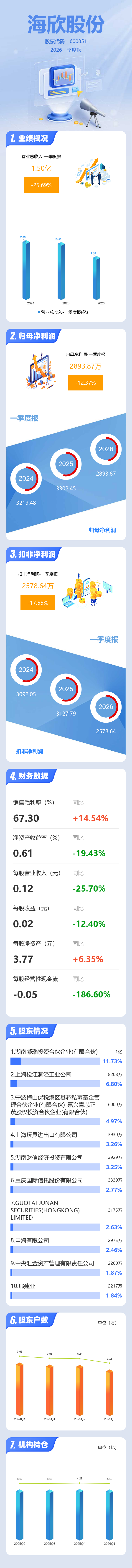 证券之星消息,海欣股份2026年一季报显示,一季度公司主营收入1.5亿元,同比下降25.7%;归母净利润2893.87万元,同比下降12.37%;扣非净利润2578.64万元,同比下降17.56%;负债率14.63%,投资收益2577.72万元,财务费用-11.9万元,毛利率67.3%。
