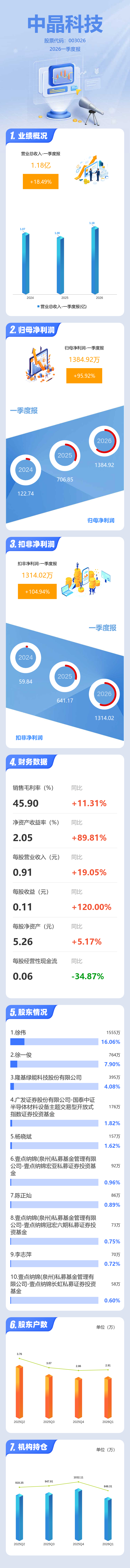 证券之星消息,中晶科技2026年一季报显示,一季度公司主营收入1.18亿元,同比上升18.5%;归母净利润1384.92万元,同比上升95.93%;扣非净利润1314.02万元,同比上升104.94%;负债率46.06%,财务费用326.22万元,毛利率45.9%。