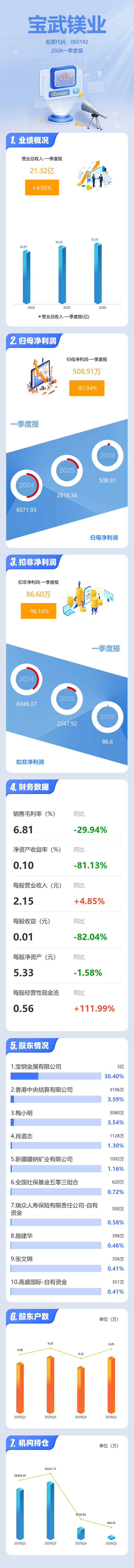 证券之星消息,宝武镁业2026年一季报显示,一季度公司主营收入21.32亿元,同比上升4.86%;归母净利润508.91万元,同比下降81.94%;扣非净利润86.6万元,同比下降96.15%;负债率58.49%,投资收益-2606.58万元,财务费用3857.91万元,毛利率6.81%。
