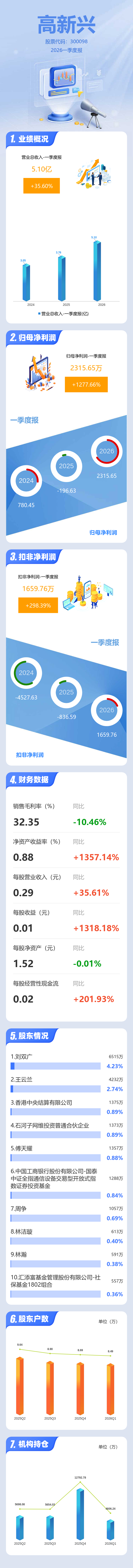 证券之星消息,高新兴2026年一季报显示,一季度公司主营收入5.1亿元,同比上升35.61%;归母净利润2315.65万元,同比上升1277.66%;扣非净利润1659.76万元,同比上升298.39%;负债率45.22%,投资收益-447.16万元,财务费用-487.35万元,毛利率32.35%。
