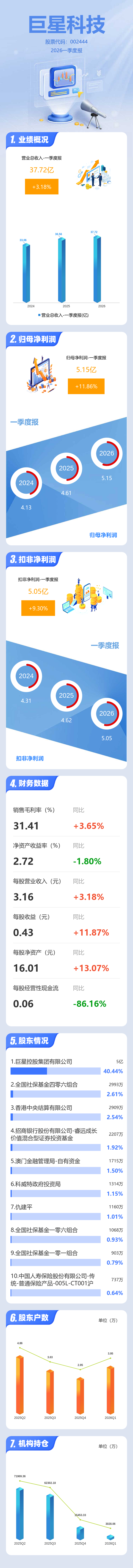 证券之星消息,巨星科技2026年一季报显示,一季度公司主营收入37.72亿元,同比上升3.18%;归母净利润5.15亿元,同比上升11.87%;扣非净利润5.05亿元,同比上升9.31%;负债率18.35%,投资收益1.28亿元,财务费用6619.17万元,毛利率31.41%。