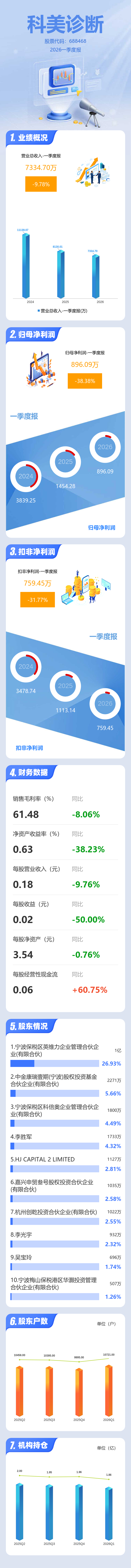 证券之星消息,科美诊断2026年一季报显示,一季度公司主营收入7334.7万元,同比下降9.78%;归母净利润896.09万元,同比下降38.38%;扣非净利润759.45万元,同比下降31.77%;负债率19.51%,投资收益164.94万元,财务费用-150.7万元,毛利率61.48%。