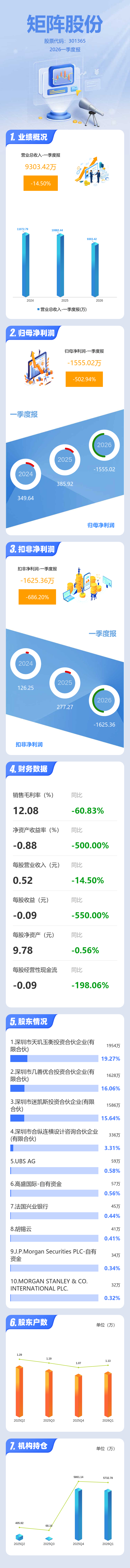 证券之星消息,矩阵股份2026年一季报显示,一季度公司主营收入9303.42万元,同比下降14.51%;归母净利润-1555.02万元,同比下降502.94%;扣非净利润-1625.36万元,同比下降686.21%;负债率16.8%,投资收益52.03万元,财务费用-604.24万元,毛利率12.08%。