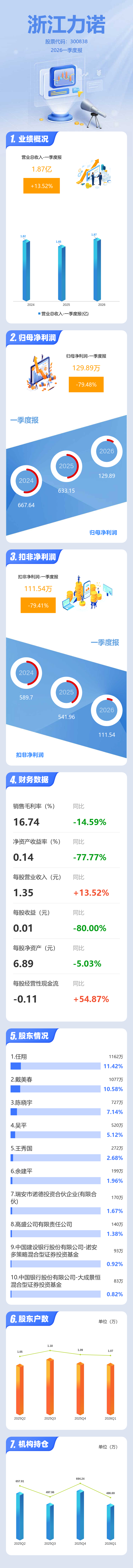 证券之星消息,浙江力诺2026年一季报显示,一季度公司主营收入1.87亿元,同比上升13.52%;归母净利润129.89万元,同比下降79.49%;扣非净利润111.54万元,同比下降79.42%;负债率47.47%,投资收益-83.29万元,财务费用203.53万元,毛利率16.74%。