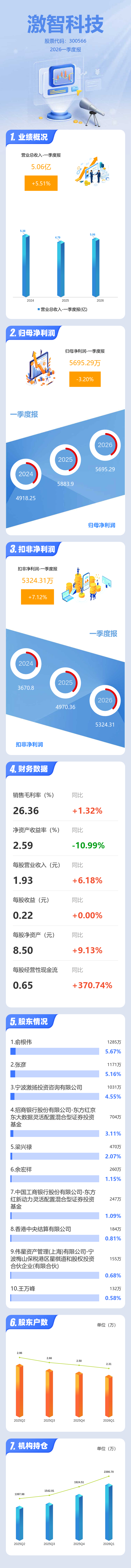 证券之星消息,激智科技2026年一季报显示,一季度公司主营收入5.06亿元,同比上升5.52%;归母净利润5695.29万元,同比下降3.21%;扣非净利润5324.31万元,同比上升7.12%;负债率36.42%,投资收益-205.07万元,财务费用523.88万元,毛利率26.36%。