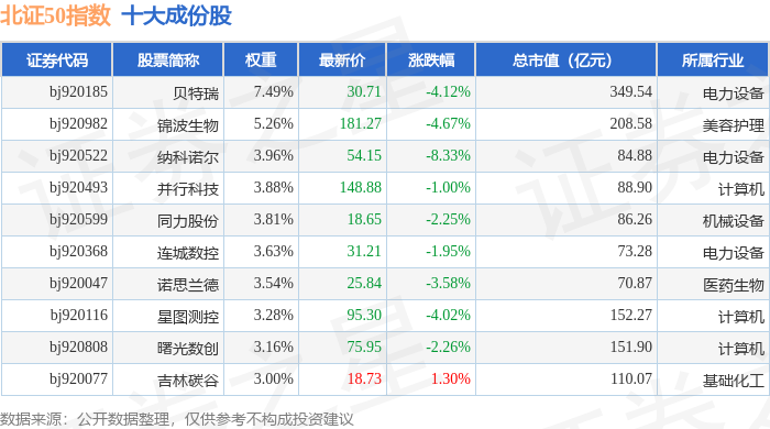 北证50(899050)指数十大成份股详情如下: