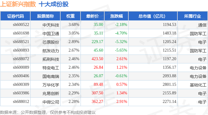 证券之星消息,4月28日,上证新兴(000067)指数报收于9292.81点,跌0.93%,成交1654.9亿元,换手率1.32%。当日该指数成份股中,上涨的有16家,药明康德以10.0%的涨幅领涨,下跌的有34家,航发动力以5.65%的跌幅领跌。