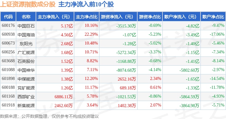 资金流向方面,上证资源(000068)指数成份股当日主力资金净流出合计31.2亿元,游资资金净流入合计4.1亿元,散户资金净流入合计27.09亿元。成份股资金流向详情见下表: