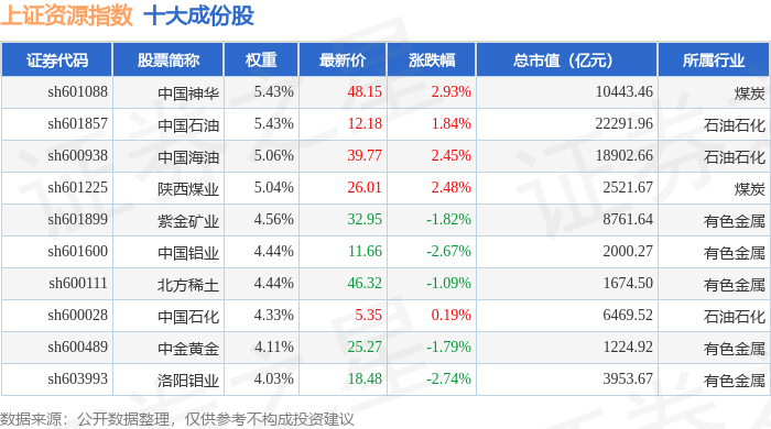 上证资源(000068)指数十大成份股详情如下: