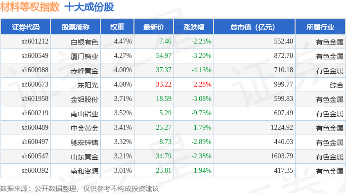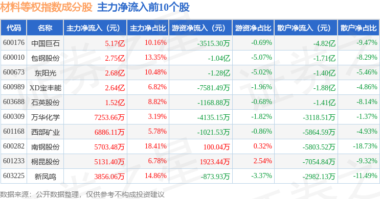 资金流向方面,材料等权(000071)指数成份股当日主力资金净流出合计27.28亿元,游资资金净流入合计5.26亿元,散户资金净流入合计22.02亿元。成份股资金流向详情见下表: