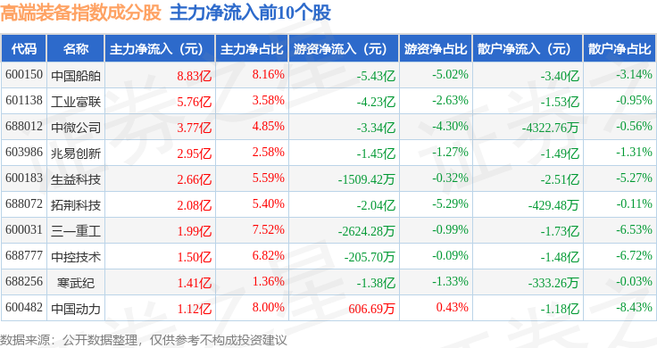资金流向方面,高端装备(000097)指数成份股当日主力资金净流出合计80.46亿元,游资资金净流入合计20.98亿元,散户资金净流入合计59.48亿元。成份股资金流向详情见下表: