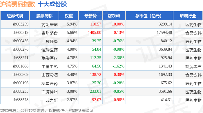 沪消费品(000103)指数十大成份股详情如下:
