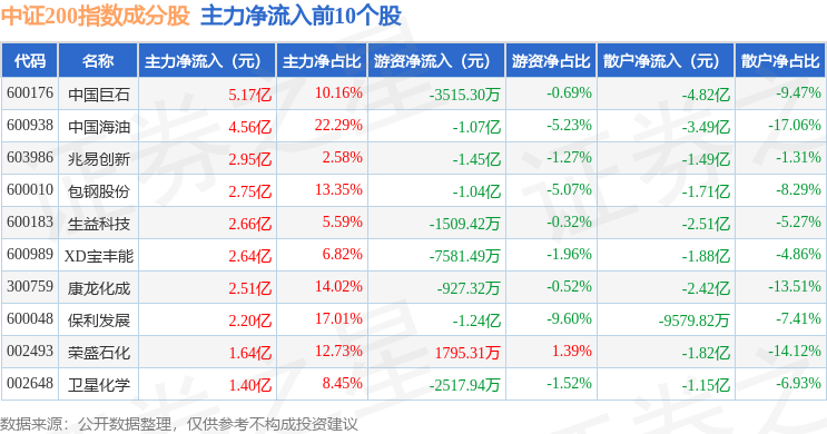资金流向方面,中证200(000904)指数成份股当日主力资金净流出合计146.88亿元,游资资金净流入合计44.48亿元,散户资金净流入合计102.4亿元。成份股资金流向详情见下表:
