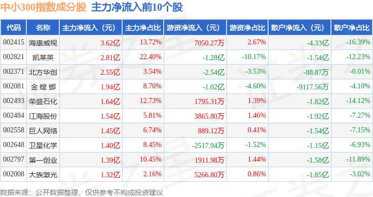 资金流向方面,中小300(399008)指数成份股当日主力资金净流出合计168.09亿元,游资资金净流入合计34.87亿元,散户资金净流入合计133.22亿元。成份股资金流向详情见下表: