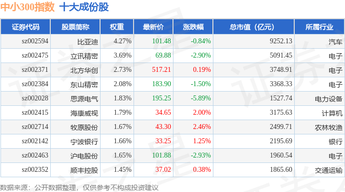 中小300(399008)指数十大成份股详情如下: