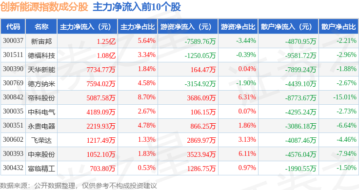 资金流向方面,创新能源(399266)指数成份股当日主力资金净流出合计39.8亿元,游资资金净流入合计14.43亿元,散户资金净流入合计25.37亿元。成份股资金流向详情见下表: